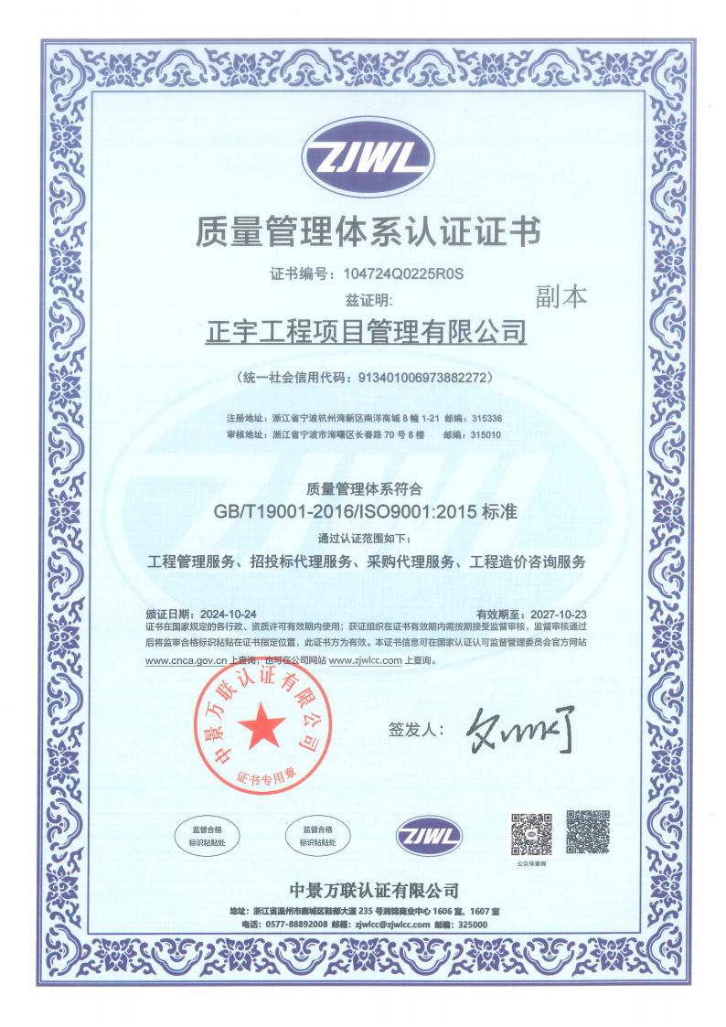 正宇工程項目管理有限公司成立于2009年,注冊資金6080萬,注冊地為浙江省寧波市杭州灣新區。公司擁有國家住建部頒發的工程造價企業甲級資質、招標代理資質等等;是一家專業從事工程項目管理、企業管理、政府采購代理服務、招投標代理服務、信息技術咨詢服務及其他技術服務的綜合型工程咨詢公司。